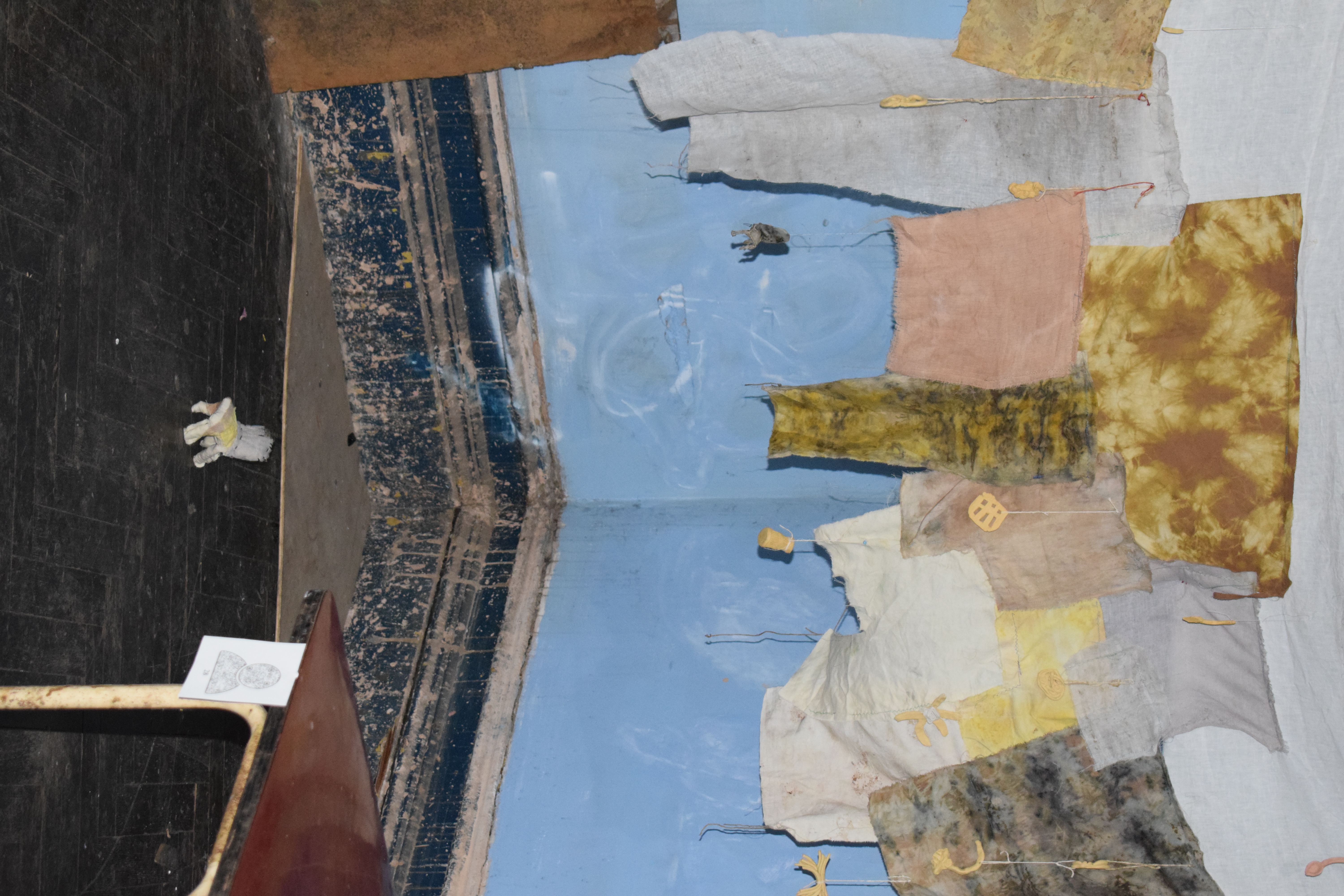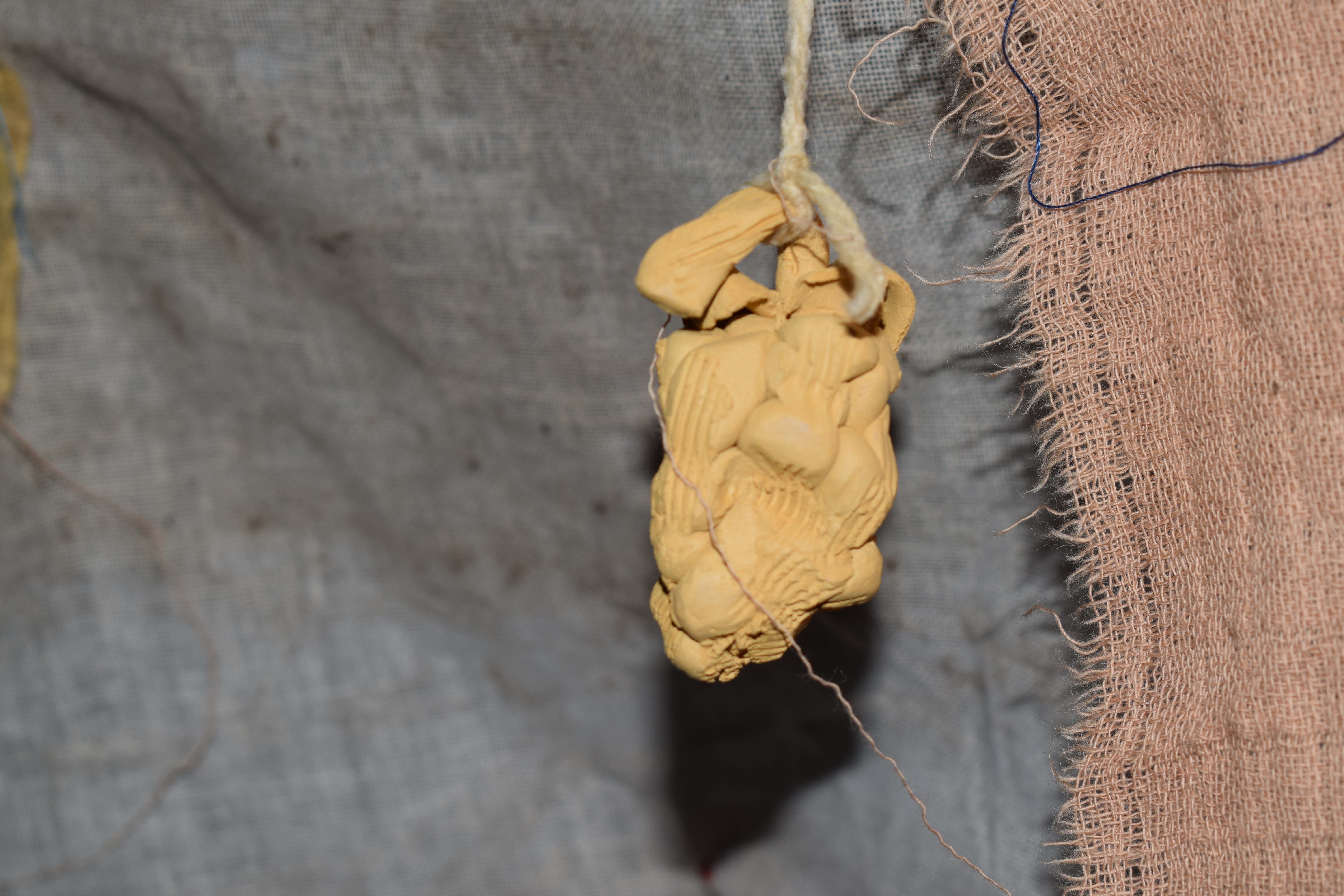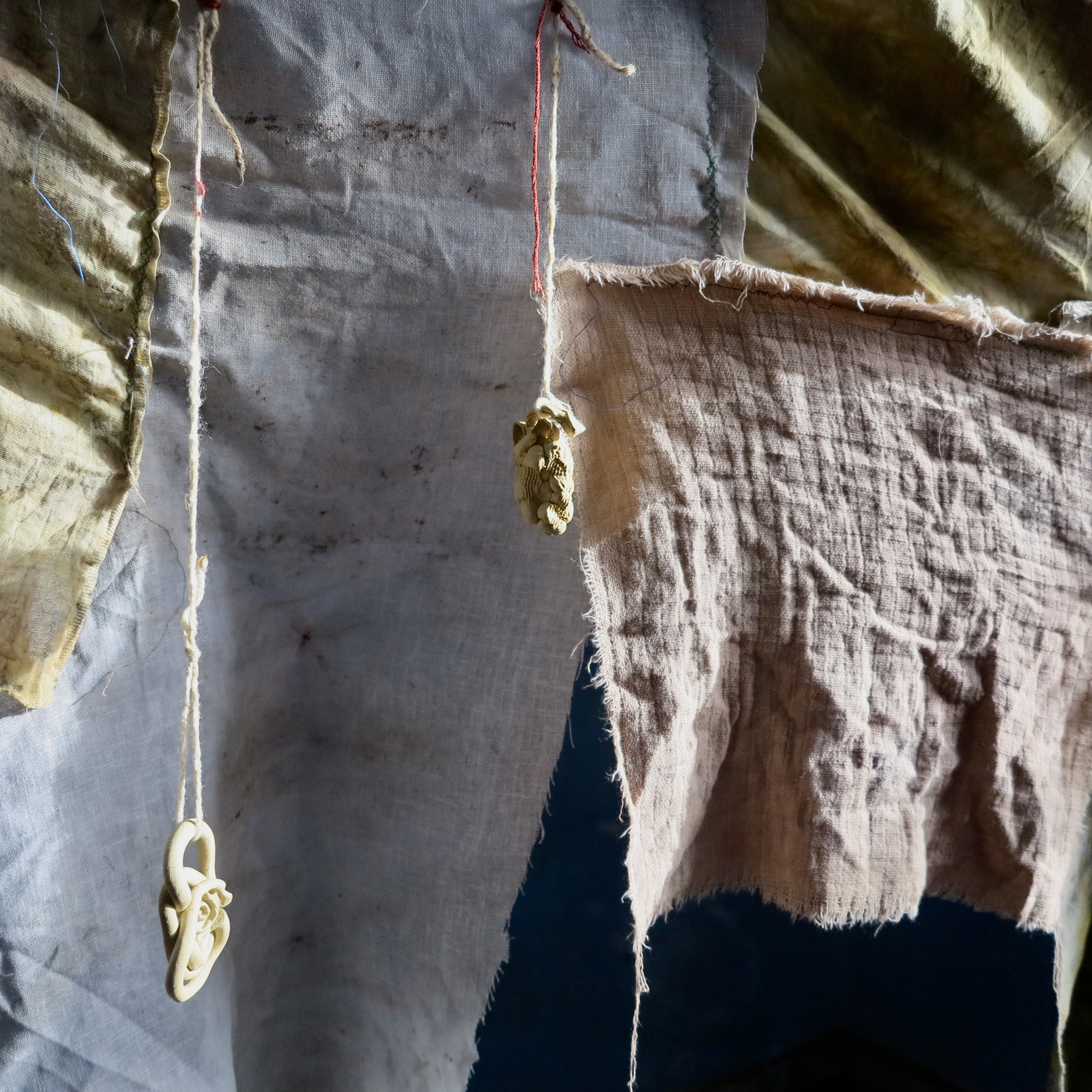 'Cloathed in Green, They Would do Good', Devon clay, second-hand textiles dyed with food waste, thread, garden string, 2023
