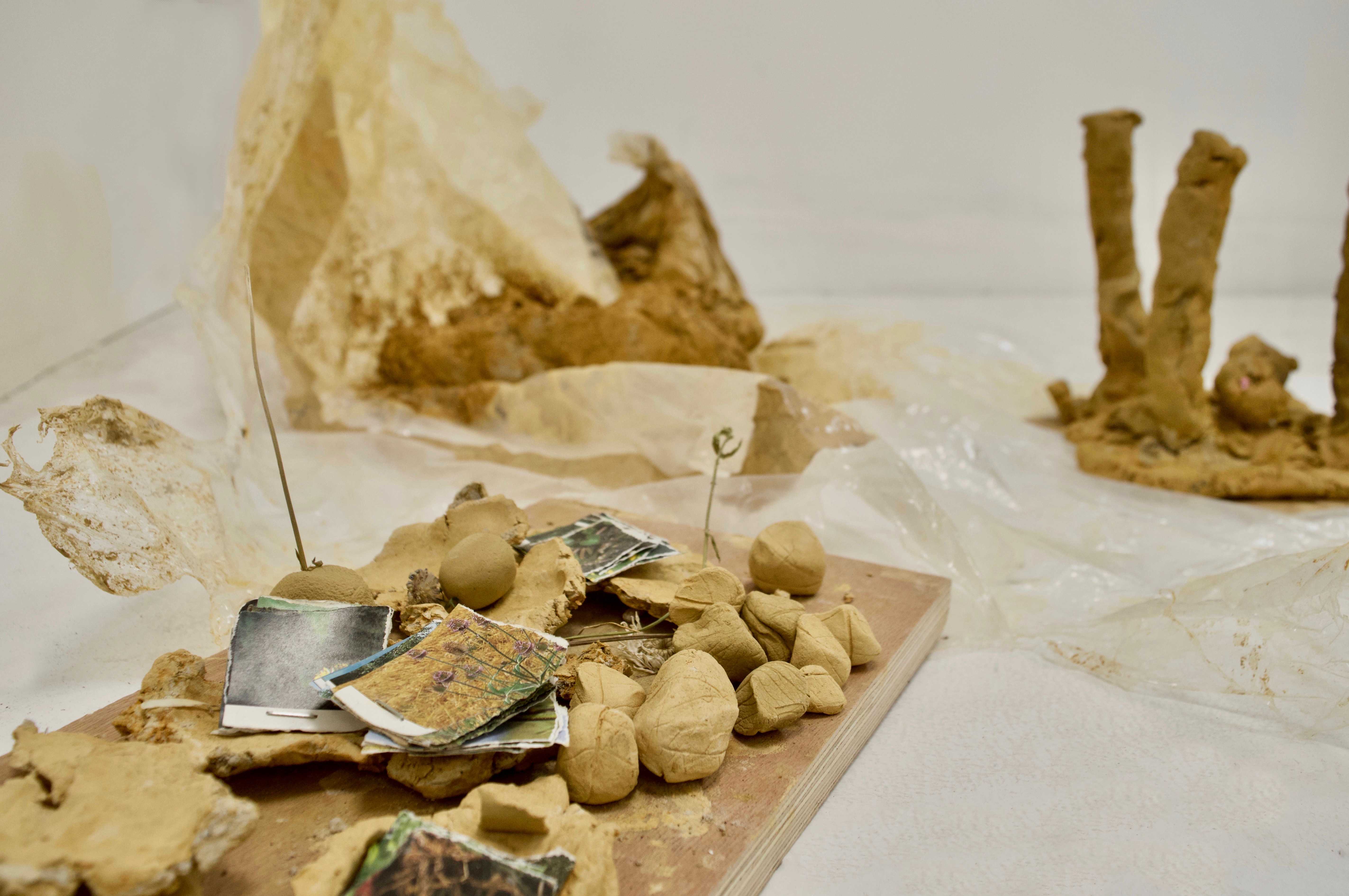 Foraged clay, paper, plastic, ash, coal, graphite, clips, canvas, binbags, bucket, plastic sheets, debris, pressed flowers, leaves, volcanic rock
