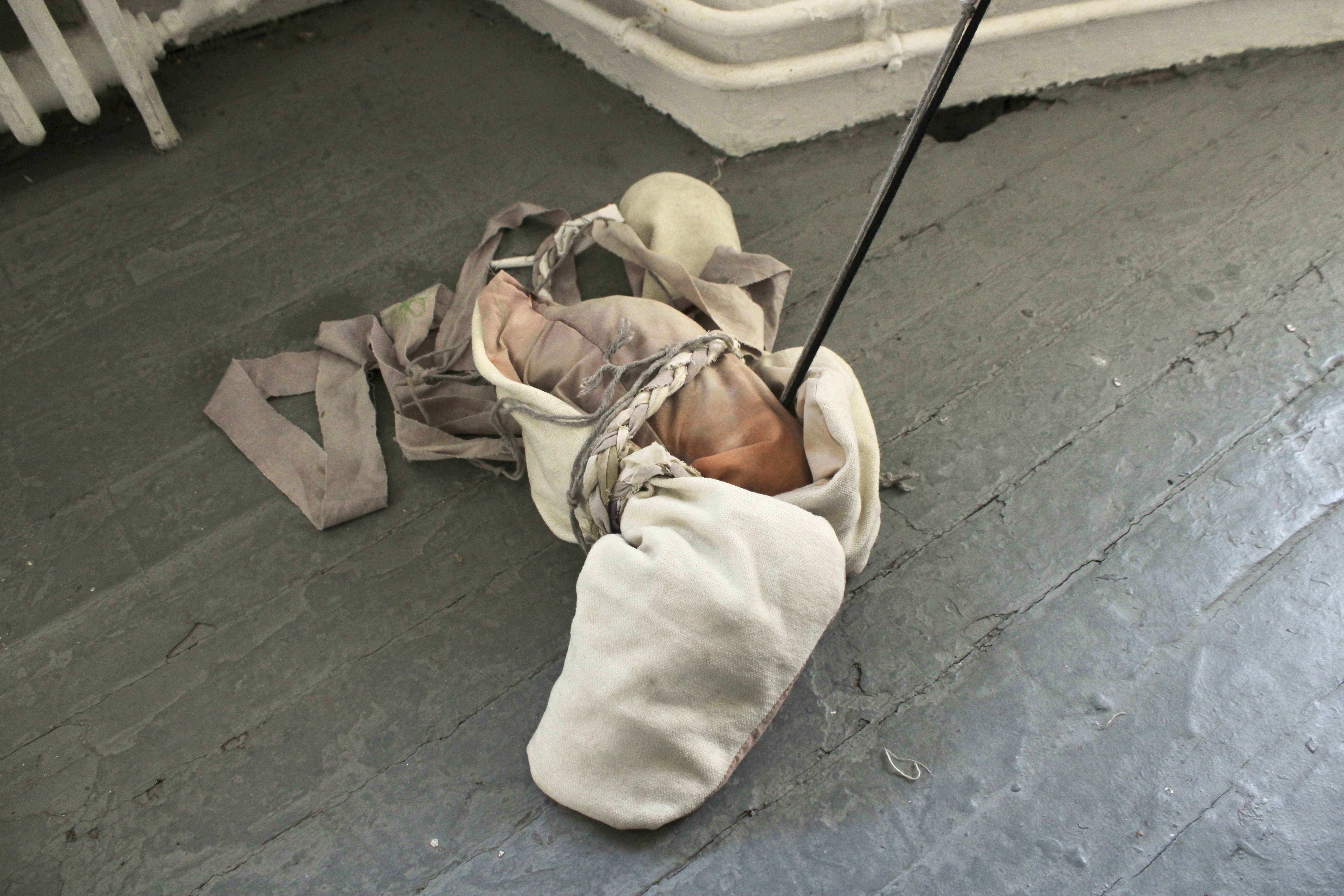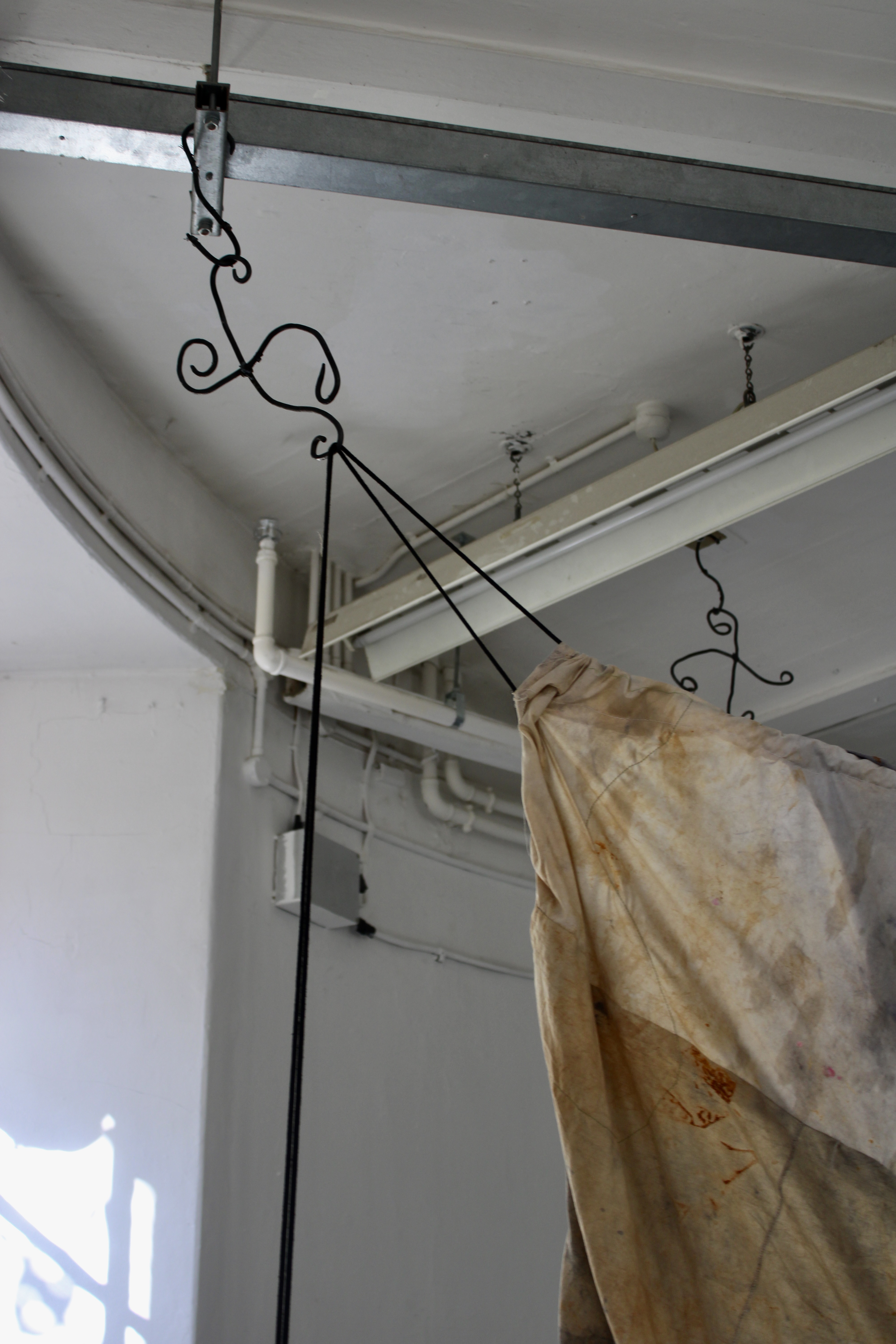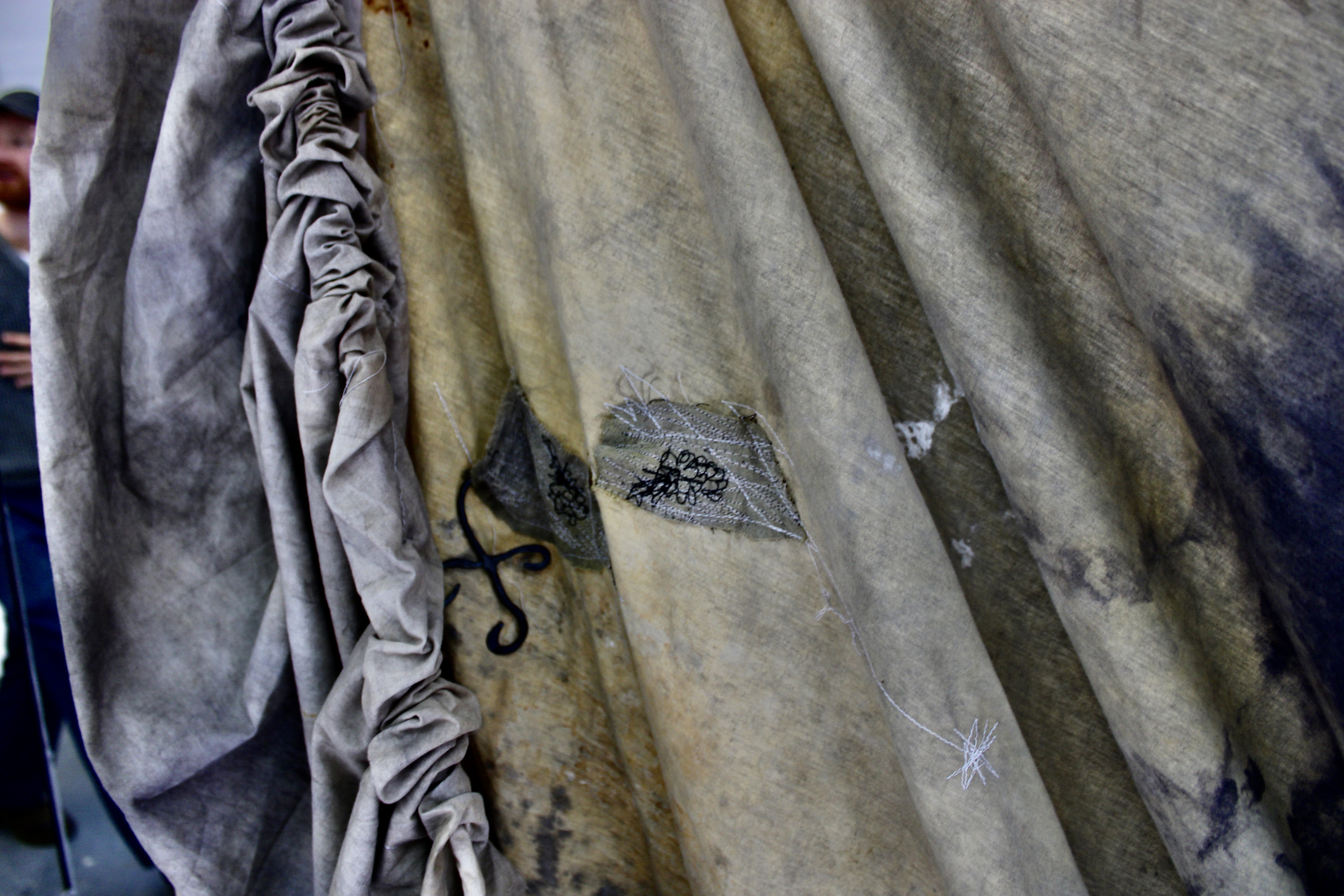 2025, Cotton dyed with rust and oak galls, welded steel, rope, naturally dyed sand bags