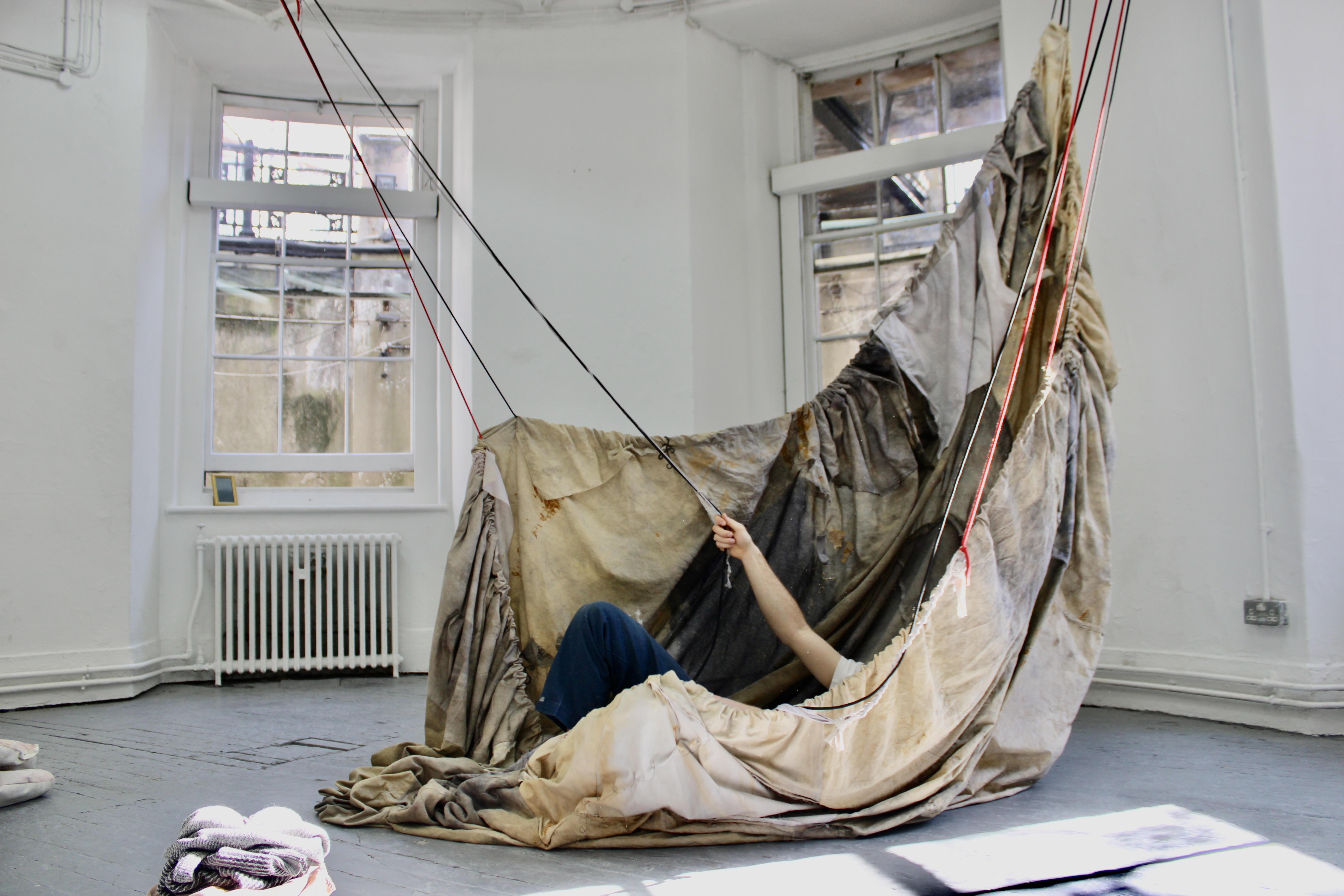 This sculpture is interective. The audience is invited to get inside the pocket whilst others pull the ropes to raise and lower the fabric.